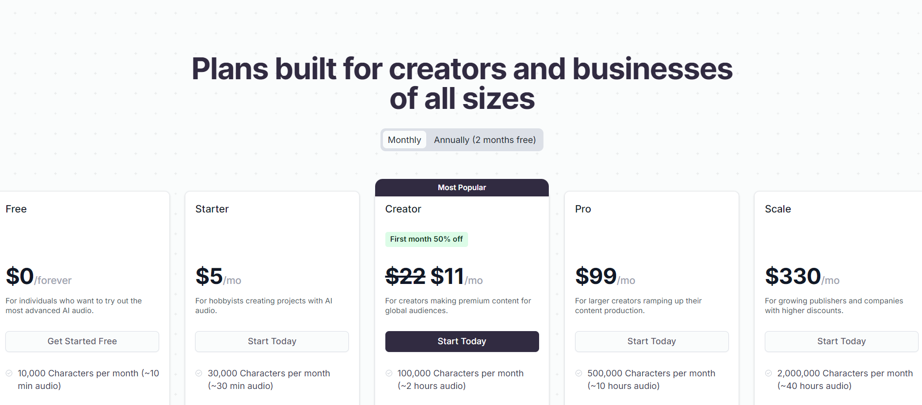ElevenLabs offers multiple pricing tiers: